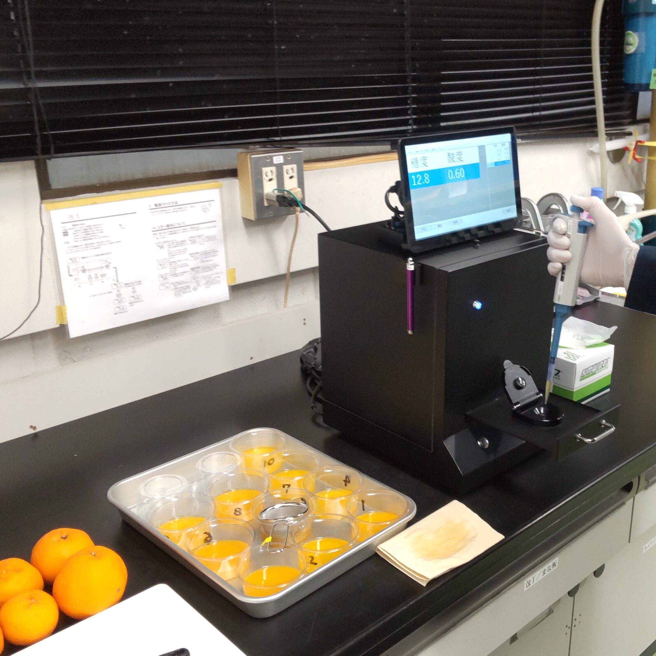 具体的には、みかんを一つずつ絞って果汁にします。その後、糖度計で甘さを測ったり、果汁を薄め、試薬を加えて酸っぱさを測ったりと複雑ですごく面倒。